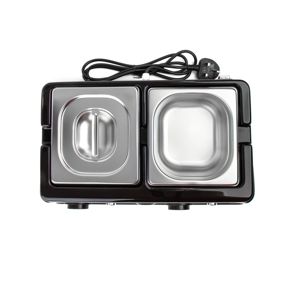 It consists of a heat resistant plastic case with 2 covered stainless steel bowls, that are removable for ease of cleaning. Each bowl has a 1.5ltr capacity. The dry heat system warms the base and sides of the containers, to give an even temperature all around for your product.