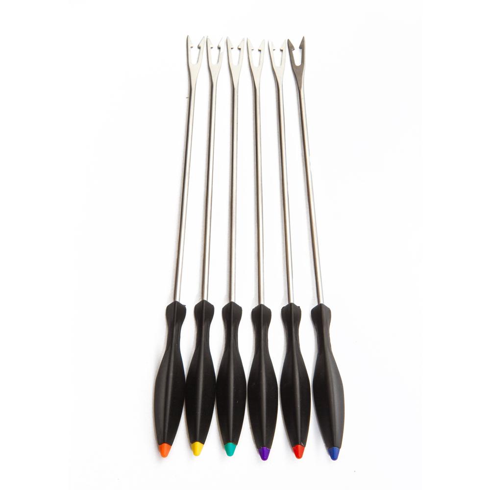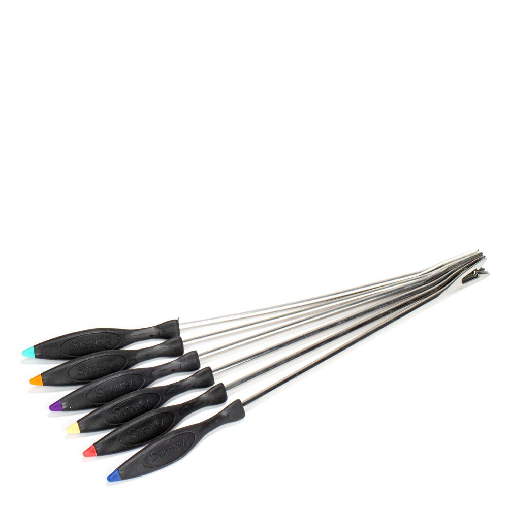 Metal Fondue Skewers—a set of six exquisitely crafted tools designed to bring sophistication and ease to your culinary gatherings. Each skewer is colour tipped, dual pronged, made from high-quality, durable stainless steel, ensuring longevity and resistance to wear and tear, even after countless dips into delicious melted cheese, chocolate, or broth.