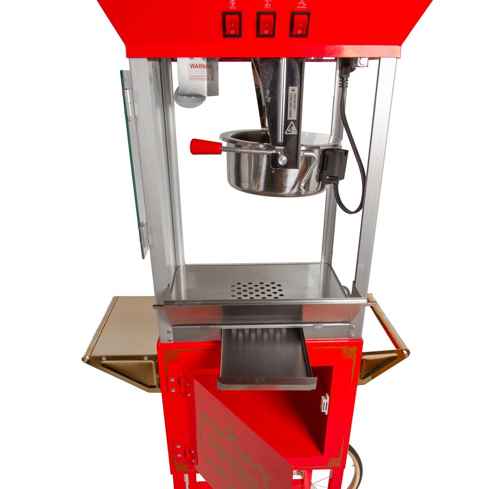 Perfect for cinemas, sports stadiums, and concession stands, this popcorn machine is both functional and visually appealing. The nostalgic design and vibrant red finish make it a standout centrepiece, drawing attention and boosting impulse sales. The detachable two-wheeled cart makes it easy to position the machine wherever you need it, while rubber feet allow stable use as a countertop appliance.