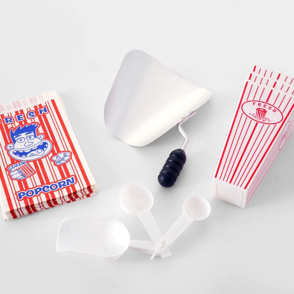 1 x Sephra 8oz Popcorn Machine, 1 x Cart, 1 x Aluminium Popcorn Scoop, 1 x Set Plastic Measuring Spoons (Includes 1 x Sugar Spoon, 1 x Oil Spoon, 1 x Popcorn Spoon), 3 x Plastic Popcorn Tubs, 20 x Paper Popcorn Bags