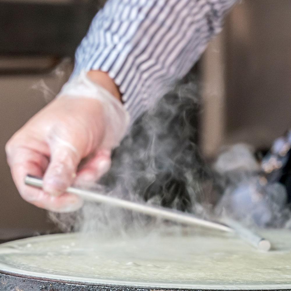 A: Pour batter onto the hot plate, place the spreader lightly on the batter, then move it in a smooth circular motion to push the batter outwards into a thin, even layer. Use light pressure — let the batter do the work.