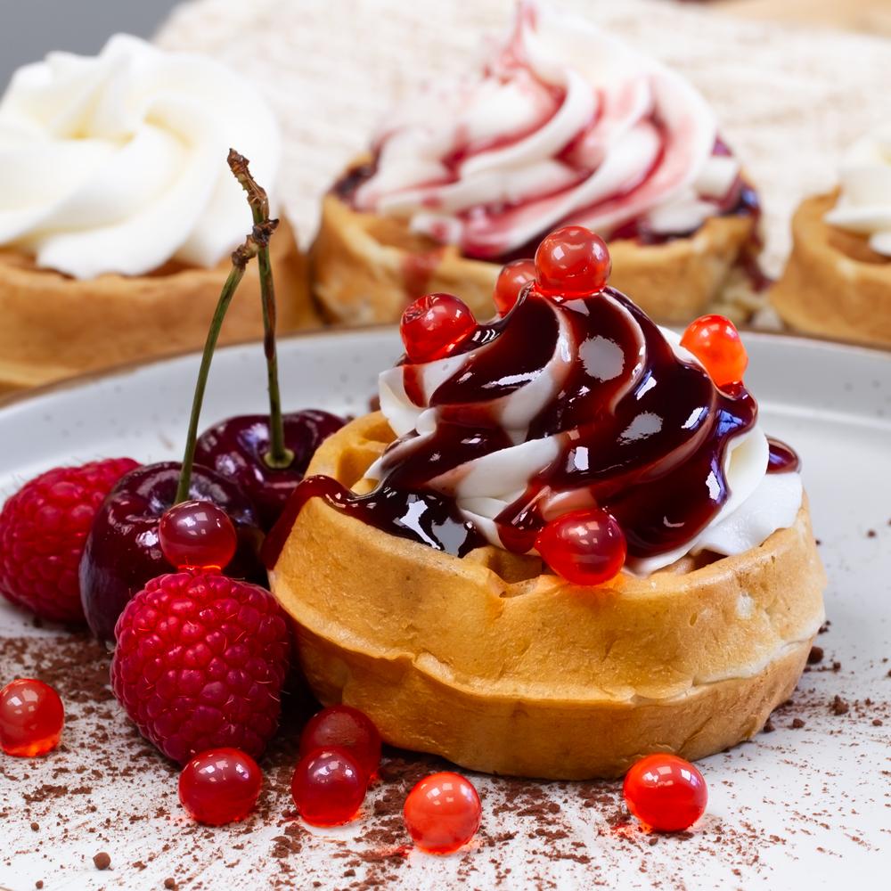 | Pour over waffles or pancakes | Cherry Bakewell Waffle – Waffle topped with cherry sauce, almond flakes and a drizzle of icing. |