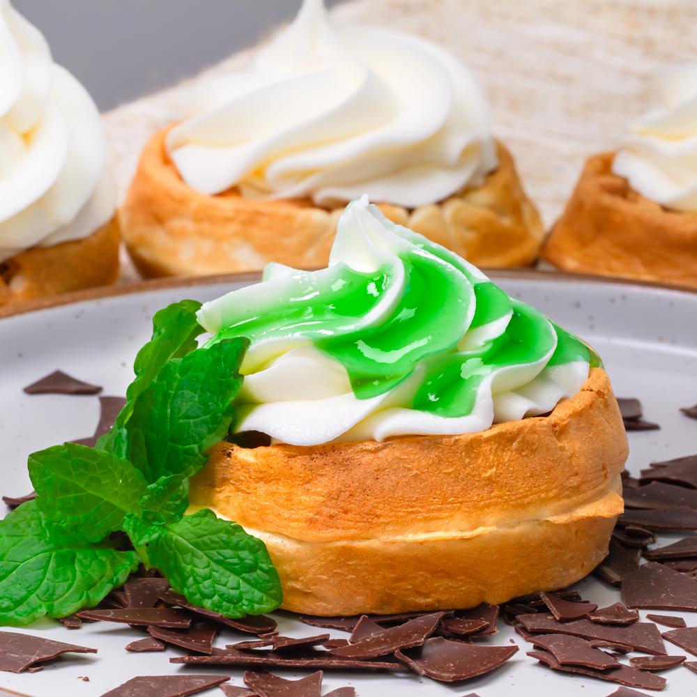 | Pour onto waffles or pancakes | Frosty Mint Waffle – Warm waffle topped with mint drizzle and mini chocolate balls |