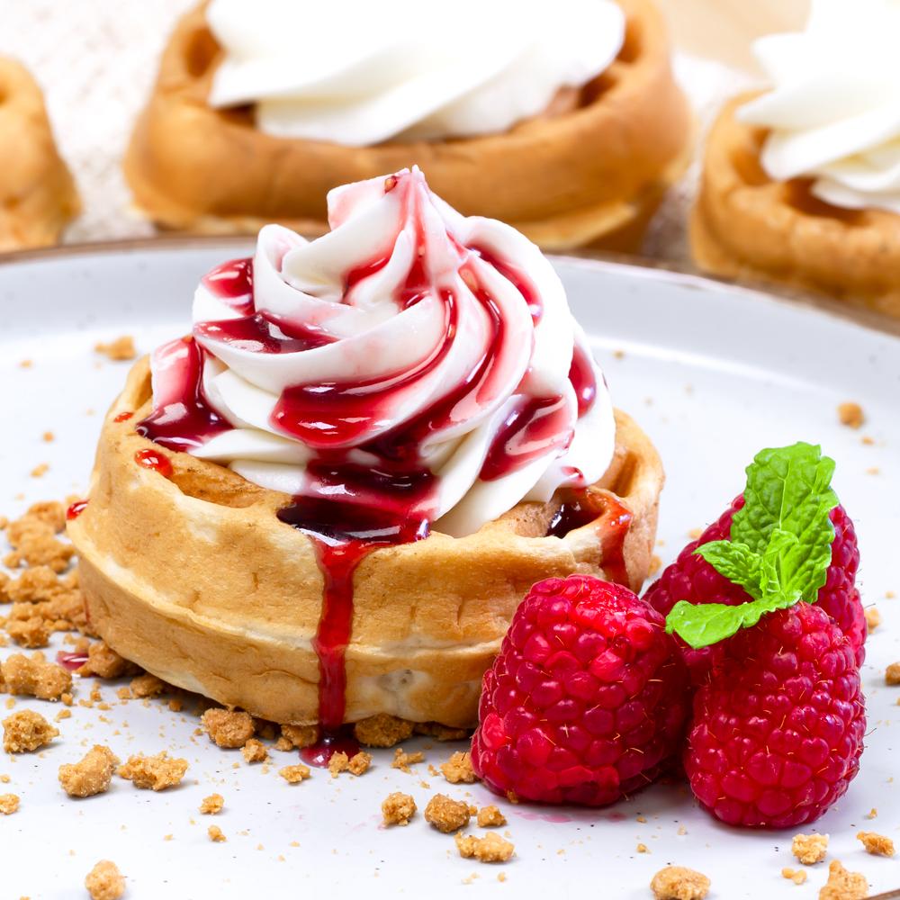 | Pour over waffles or pancakes | Raspberry Cheesecake Waffle – Topped with biscuit crumb, raspberry sauce and cream cheese-style drizzle |